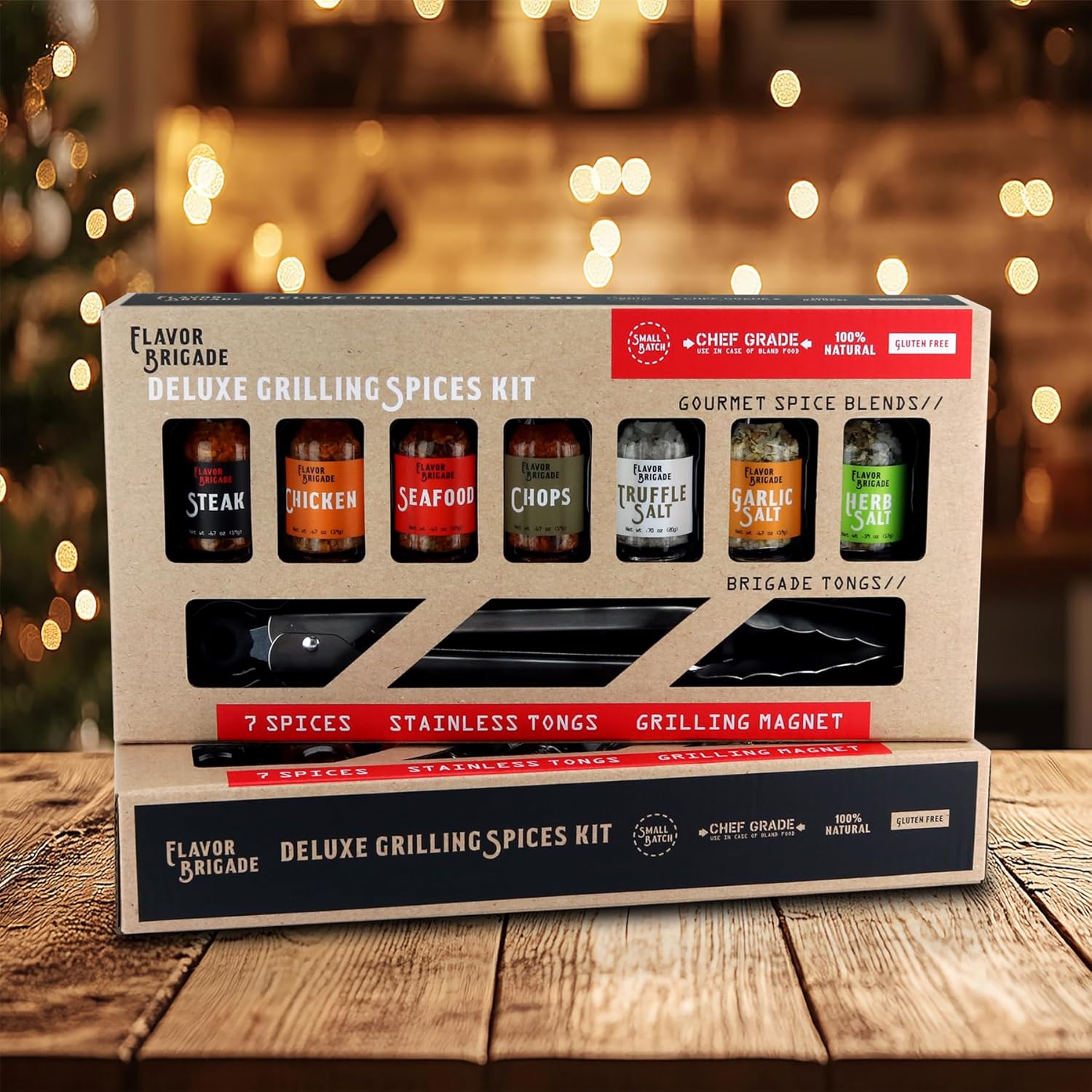 - Grilling gift for guys: 7 Gourmet Quality Spices, Stainless Steel Tongs, Grilling Temp BBQ Magnet