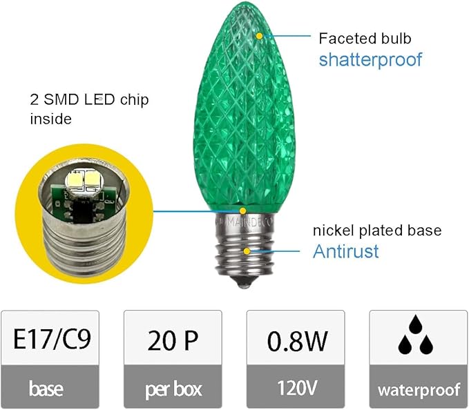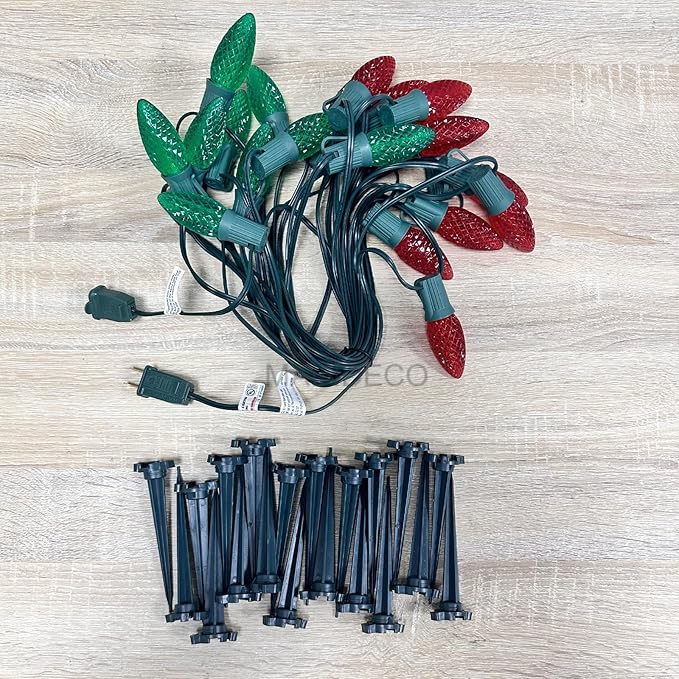 - C9 LED Pathway Lights - MAINDECO C9 Christmas walkway lights are 30 feet long in total which contain 20 red and green C9 LED SMD strawberry faceted bulbs with 18 inches spacing, 20 Stakes, E17 base sockets. After installing the ground stakes, it can be fixed in the ground to add Christmas holiday lights to your yard, garden and pathway, etc.
