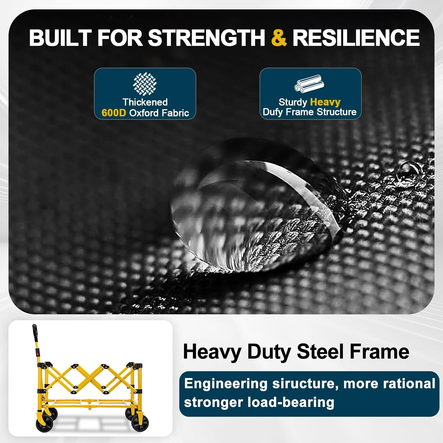 - LARGE CAPACITY - DURABLE COLLAPSIBLE WAGON: The collapsible wagon has an expansion size of 26.1"x 16.9"x 36.6" (L*W*H) and load up to 220LBS, which can carry all the goods your family needs for outdoor camping. The wagon body is made of lightweight aluminum alloy, compared to other products, our product is lightweight and strong, with anti-corrosion coating on the surface, which can prevent the body from rusting. Waterproof fabric, waterproof and durable, tear resistant, removable and washable