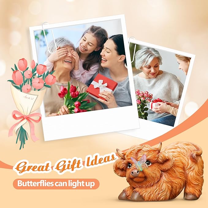 Highland Cow Solar Powered Outdoor Garden Statue, Resin Highland Cow Statue with Solar Light Lantern, Decorative Lawn, Yard Outdoor Highland Cow Decor. Unique home decorations, gifts for women