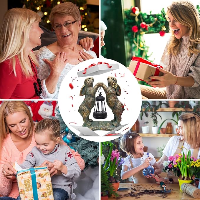 Garden Statues Rabbit with Solar Lantern, Outdoor Bunny Figurines Decorations for Patio Yard Lawn Ornaments, Gifts for Mom/Grandma Birthday Easter Housewarming