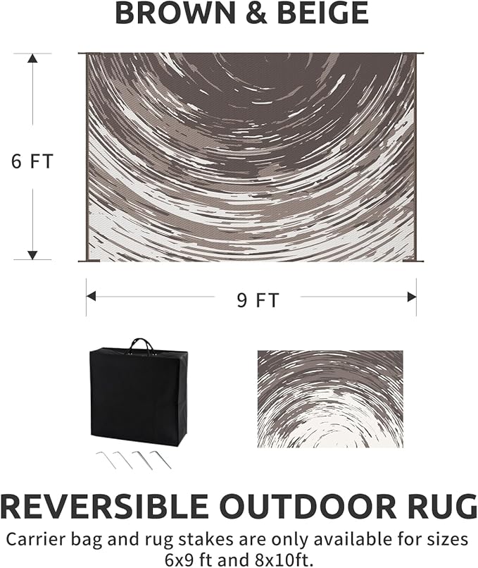 • RV traval&Camping: This camper must haves outdoor rug is ideal for picnics, gatherings, and RV trips! The lightweight outdoor camping carpet with foldable lines is easy to carry and saves space. Includes an extra carry bag and rug stakes for 6x9 ft, 8x10 ft and 9x12 ft. Grass-friendly, durable, and easy to clean, this outdoor rug enhances outdoor adventures.