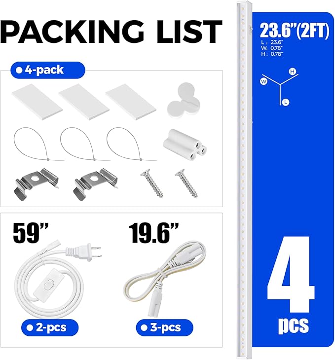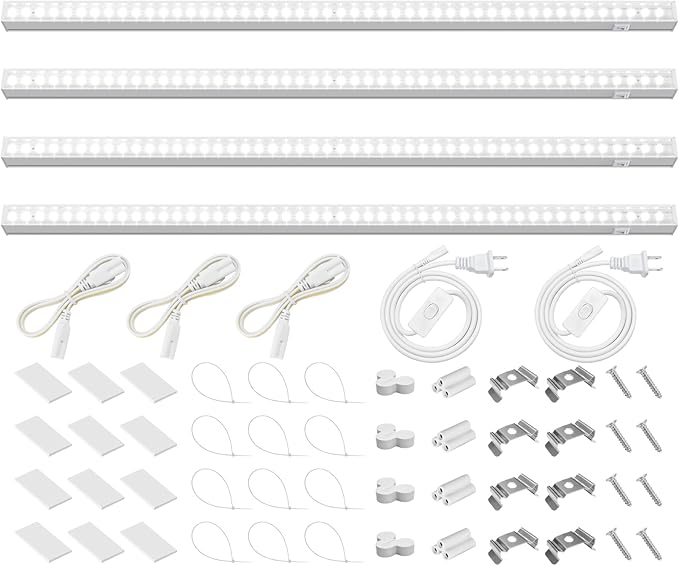 - What You Get: 4 x Barrina T5 Grow Lights, 2 x Power Cords with ON/OFF Switch, 3 x Connecting Cords (20''), 4 x Small Connectors, 8 x Installation Clips, 8 x Double-sided Tapes, 8 x Cable Ties, 4 x Dustproof Cap