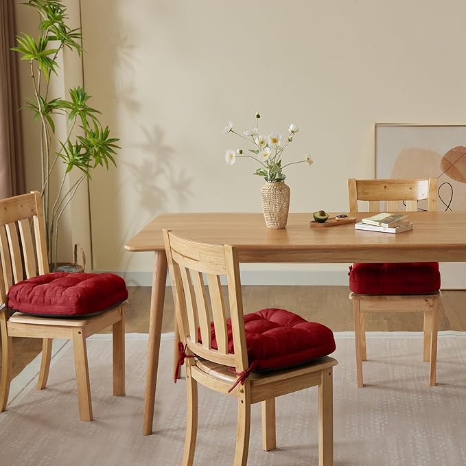 Chair Cushions for Dining Chairs, Dining Chair Cushions, Tufted Indoor Chair Pads with Ties & Non Slip Backing, Seat Cushions for Kitchen Chairs 16.5” x 16.5” x 3.5”, Set of 4, Red