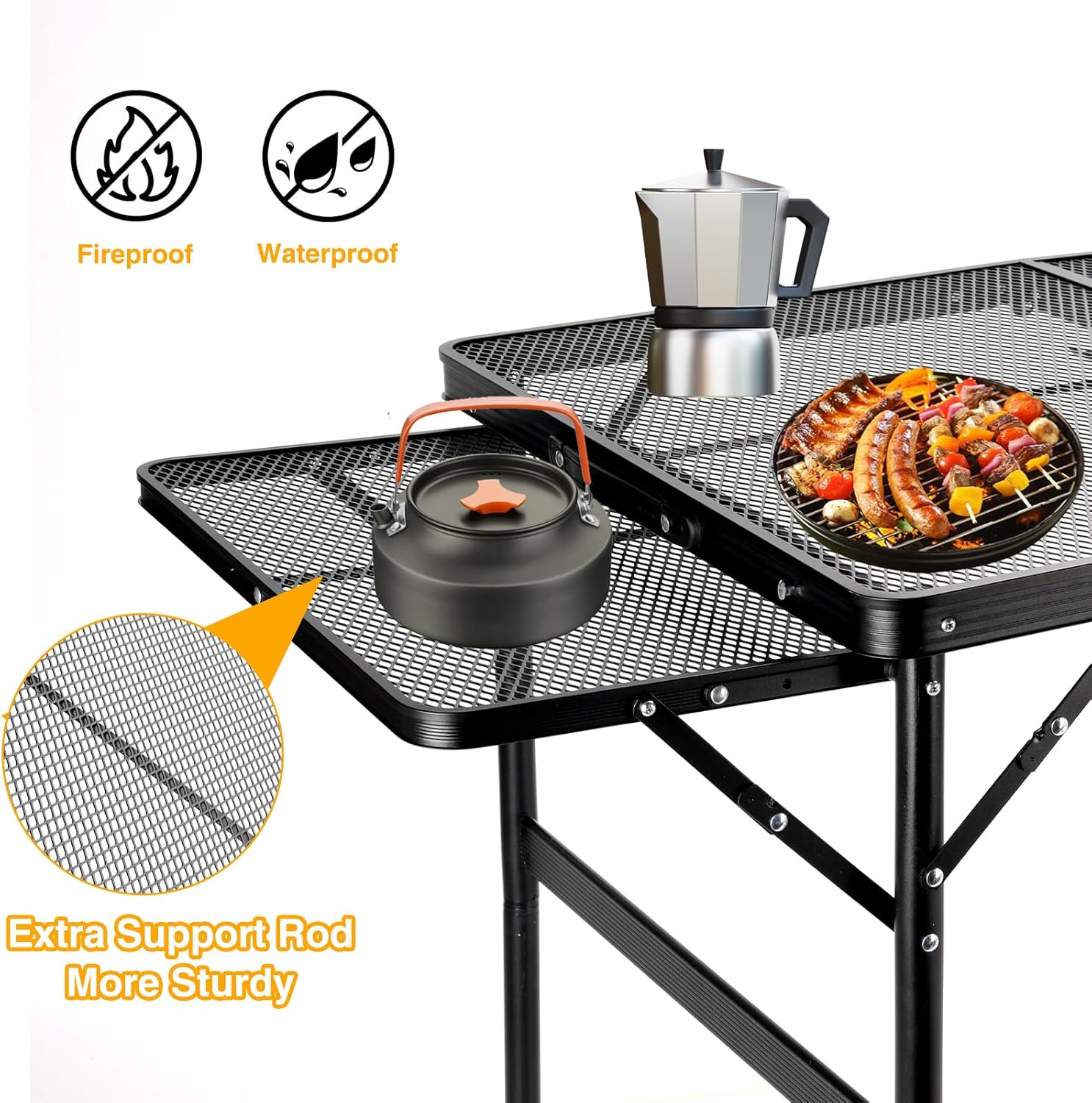 Grill Table Folding Table with 2 Wing Panels 3FT+1.4 FT with Mesh Desktop 2 Height Adjustable Portable Grill for Outdoor Indoor Beach BBQ Picnic Travel RV Black
