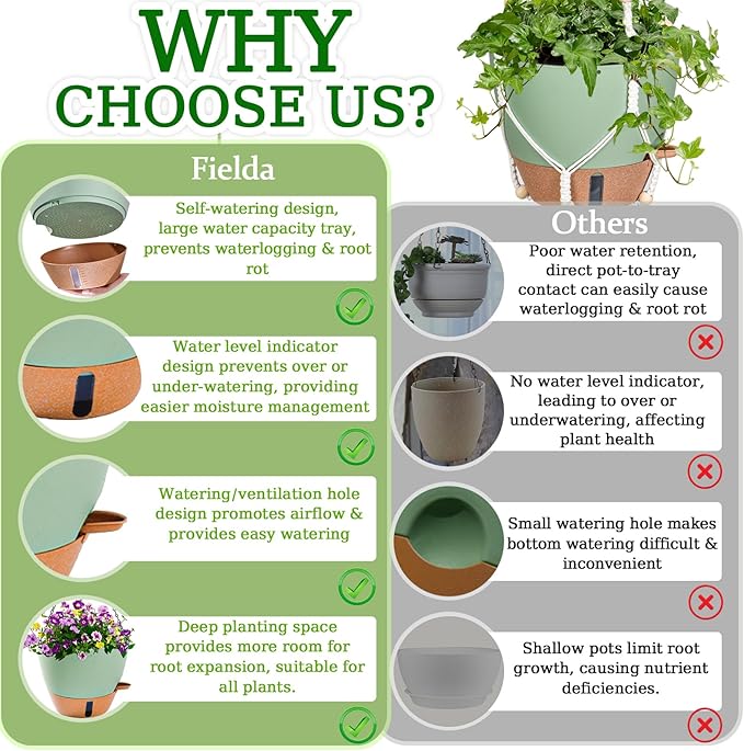 - 【Never Over/Underwater Again!】Fielda's indoor hanging planters feature an EXCLUSIVE WATER WINDOW in the base tray - instantly check moisture levels without guesswork! Protect your plants from dehydration and promote healthy root systems with this visual watering guide. Perfect for hanging pots for indoor plants enthusiasts who value scientific plant care.