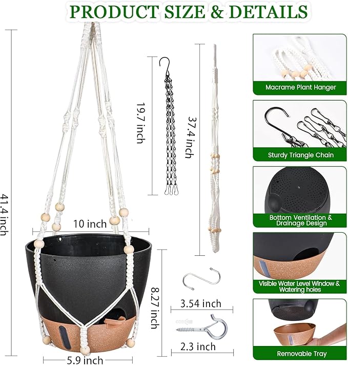 - 【Water Level Indicator Design】Unlike other hanging planters, Fielda hanging plant pot features an innovative design with a specially crafted visible window in the bottom tray, allowing you to monitor the water level at any time. This way, you can prevent plant damage from underwatering or overwatering with ease.