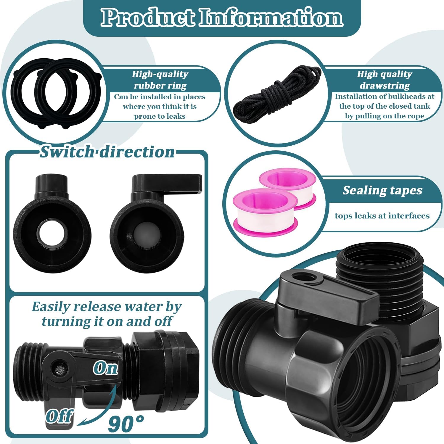 - The Set Includes: You will receive 4 pcs 3/4”Garden Hose Shut Off Valve,4 pcs 3/4”GHT Bulkhead Fitting,4 pcs rubber gasket,2 pcs thread sealing tape, and 1 traction rope
