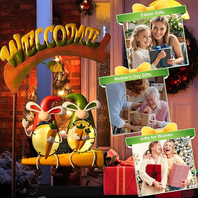 - 【Rabbit Gnome Garden Statue】Bunny outdoor statue lights can be used as both a welcome sign and a pathway light. The design of the carrot swing can make the rabbit partner swing with the wind to decorate your garden, which is a whimsical decor