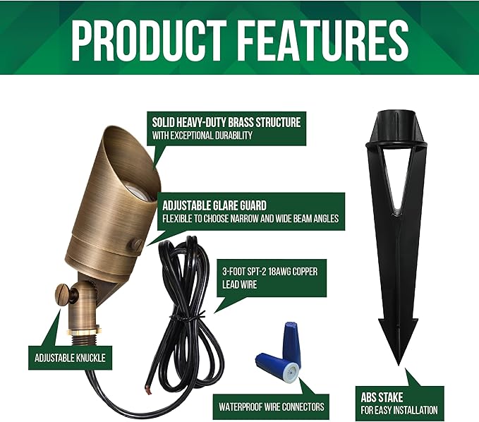 - Easy Installation๏ผEquipped with ABS ground spike, wire connectors (1 #14 w/1-3 #18 or 20, 2 #14 w/1 #18), 39.9โโ pre-wired leads, these lights can be easily installed. Compatible with most 12V landscape lighting systems. Must be powered by a 12V low voltage transformer (not included). MR16 Bulb not included.