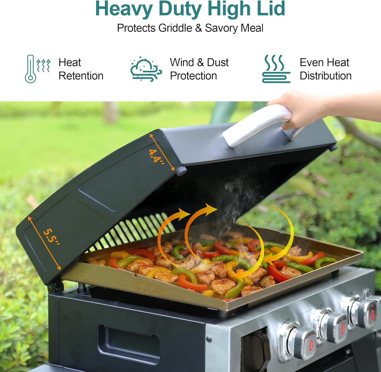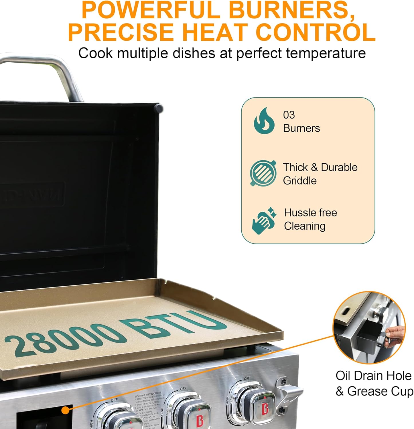 - Execellent Heat Control: 3 stainless steel burners with total 28,000 BTUs meet all outdoor cooking needs, and heighten grill body help reduce heat flow out during cooking to avoid scalding