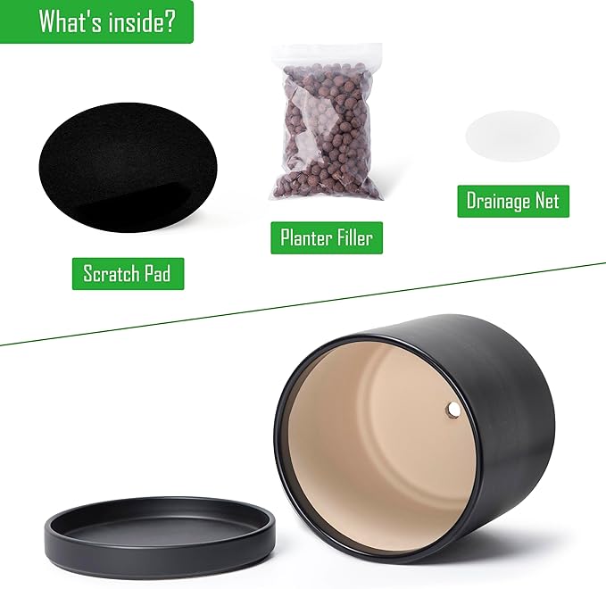 • Planter pot with drainage hole, mesh drainage net and protective scratch pad included.