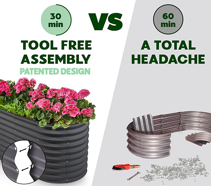 - EFFORTLESS ASSEMBLY, LIKE NO OTHER! Begin your planting journey by choosing our innovative patented design, featuring the perfect combination of easy assembly and durability. Thanks to our unique tool-free design, assembly is a breeze and can be completed in just 30 minutes! Get started on your garden right away and enjoy fresh, healthy produce in no time.