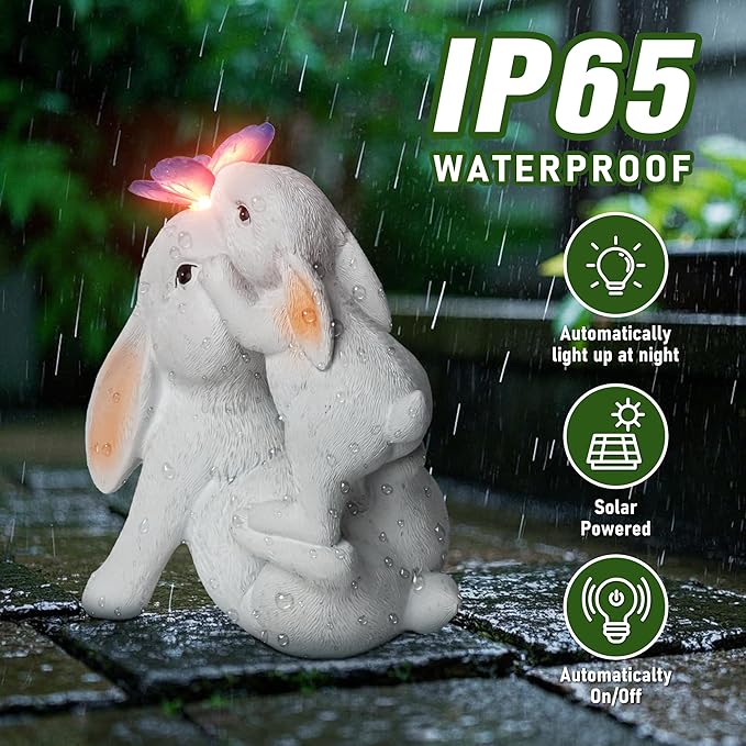 - 🐇【Solar Powered】: This solar Rabbit statue features a high-efficiency solar chip, allowing the butterfly light to charge during the day and automatically illuminate at night. With sufficient sunlight, it fully charges in 6-8 hours and provides 8-10 hours of soft lighting, making it both eco-friendly and convenient.