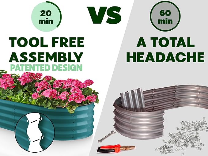 - EFFORTLESS ASSEMBLY, LIKE NO OTHER! Begin your planting journey by choosing our innovative patented design, featuring the perfect combination of easy assembly and durability. Thanks to our unique tool-free design, assembly is a breeze and can be completed in just 20 minutes! Get started on your garden right away and enjoy fresh, healthy produce in no time.