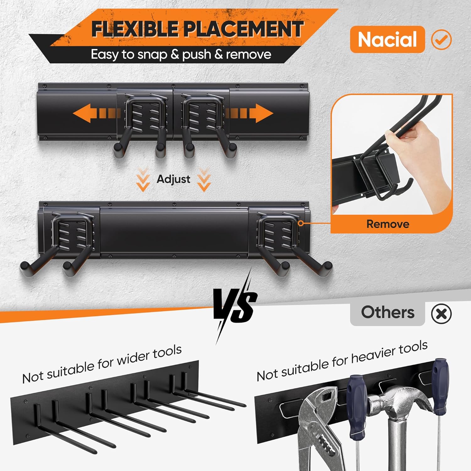 - 48-Inch Adjustable Garage Wall Tool Rack β Nacial Garage Tool Organizer Wall Mount includes 3*16" rails, 8 hooks, and 2 extension cord storage straps. The 48-inch wall-mounted rack allows for flexible tool organization, with hooks that snap onto the rail and can be easily repositioned to accommodate tools of all sizes. Ideal for your garage, utility room, workshop, or basement. Elevate Your OrganizationβGet Your Nacial Garage Tool Organizer Today!