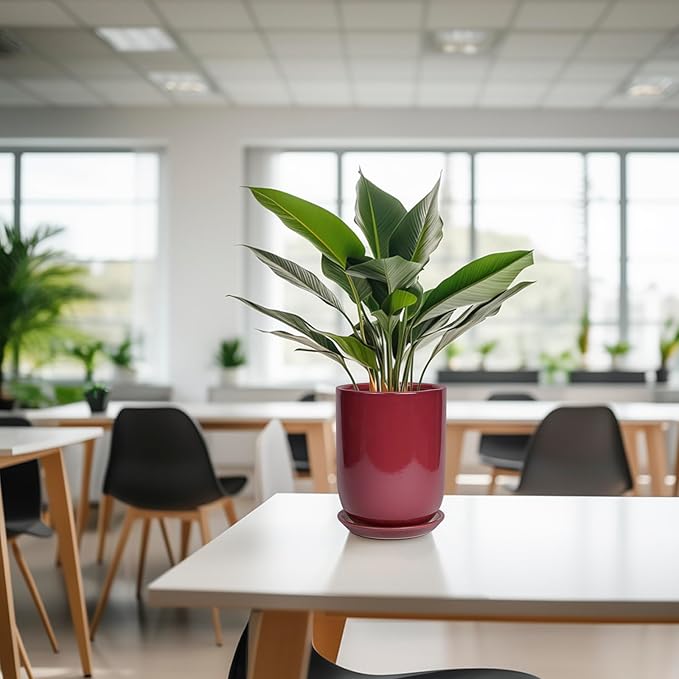 Ceramic Pot for Plants - 8 Inch Plant Pot Indoor with Drainage Hole and Saucer Cylinder Flower Pot for Indoor Outdoor Plants Home Patio Office Decor Red