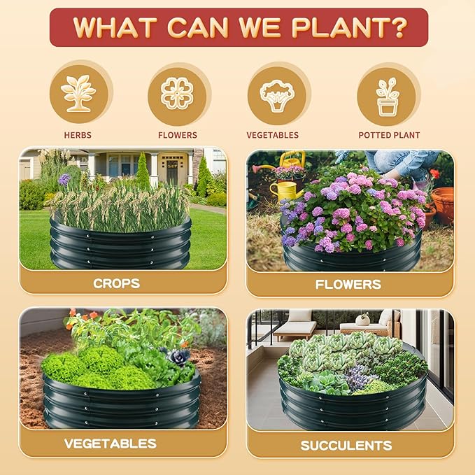 - 【DURABLE & STABLE】: ZBZBML round raised garden bed (3×3×1ft) is 36 IN Diameter,11.8IN Tall, each is made of 0.8MM thick Q195 galvanized metal sheet painted, double-layer anti-corrosion galvanizing and round structure design,it is built to providing a solid foundation for your plants.