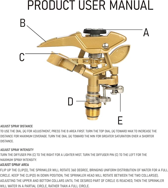 - Adjustable Design: The garden sprinkler features a 0-360 degree adjustable spray pattern. You can customize the spray distance and angle using the adjustment settings on the sprinkler head to meet your specific needs. The black component on the top can adjust the spray distance