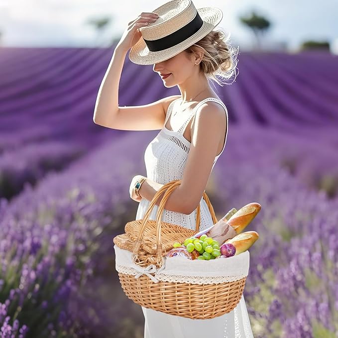 - 【Perfect PICNIC BASKET】: This picnic basket can be used for storing various items. Double swing foldable handle allows it to be stacked and stored to save space. With a double-entry lid to keep out dust, can also be used to place beverages and food at picnics. The lining can be easily removed and washed, making it reusable, clean, and hygienic. The lace detailing adds a beautiful touch
