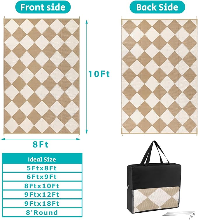 • Versatile Outdoor Carpet: The indoor outdoor plastic rugs have multiple choice in different colors(4'x6',5'x8',6'x9',8'x10',9'x12',9'x18',8'round), is ideal for a variety of indoor outdoor activities,like patio mat, deck rug, garden rug, beach mat, picnic mat, BBQ party mat, rv camping rug,pool rug,outdoor doormat,garage rug,front door mat,allowing you to have plenty of imaginable space for more fun.