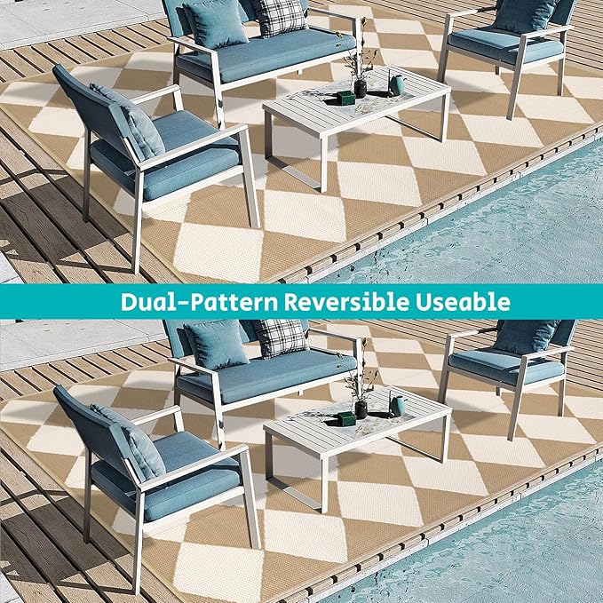 • XXL Large Reversible Outdoor Rugs: Featuring a classic moroccan pattern on both sides, this rectangular 8x10 ft outdoor area rug allows you to instantly refresh your patio, porch, backyard, deck, RV campsite. And this outdoor deck rug is reversible, two-sided design allows you to have two different looks,both sides can blend perfectly with nature and look very full and comfortable.
