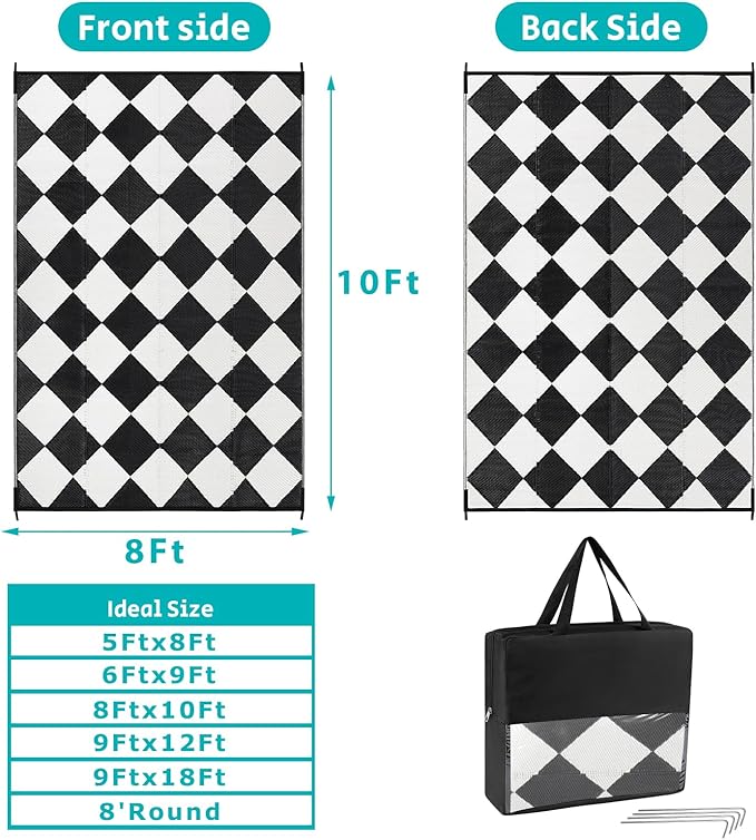 - Versatile Outdoor Carpet: The indoor outdoor plastic rugs have multiple choice in different colors(4'x6',5'x8',6'x9',8'x10',9'x12',9'x18',8'round), is ideal for a variety of indoor outdoor activities,like patio mat, deck rug, garden rug, beach mat, picnic mat, BBQ party mat, rv camping rug,pool rug,outdoor doormat,garage rug,front door mat,allowing you to have plenty of imaginable space for more fun.