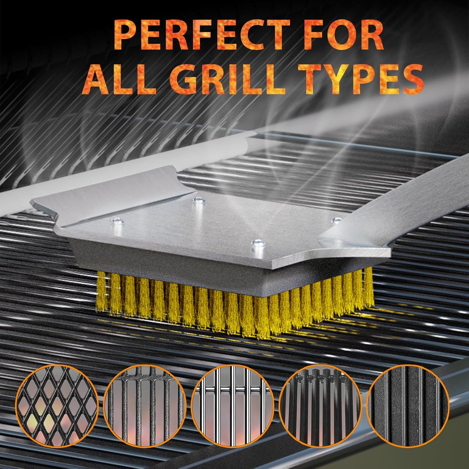 - Ergonomic Design: Our grill brush adopts a slanted neck design, and the body between the handle and the brush head is made of high quality stainless steel, which keeps the perfect angle, making it easier and safer for you to use. And you can easily scrape off grill residue with the scraper on the front of the grill brush by simply adjusting the angle