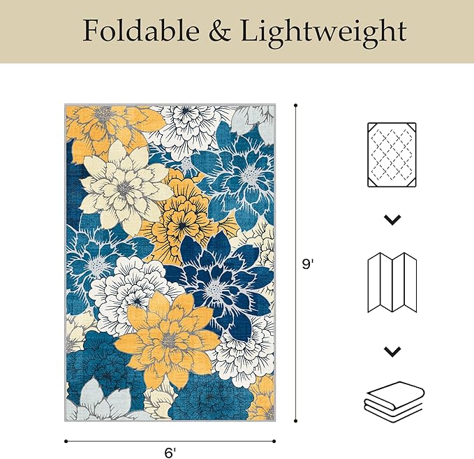 GENIMO Indoor Outdoor Area Rug 6' X 9' Waterproof, Washable Patio Rug Non Shedding, Easy Cleaning Floral Outdoor Carpet for Living Room, Bedroom, Dining Room, Balcony, Backyard, Deck, RV, Blue