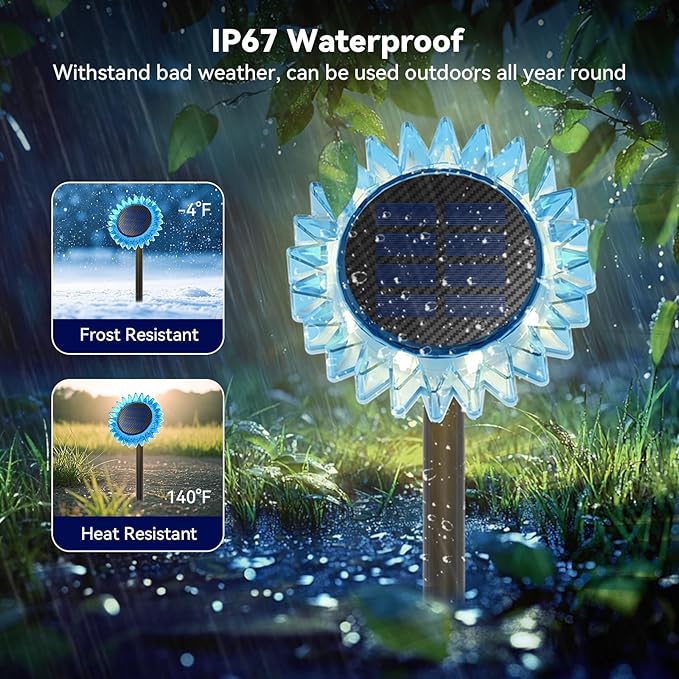 - -4ยฐF to 140ยฐF All-Weather Durability: Solar lights outdoor has passed four rounds of strict quality inspection before leaving the factory. Solar yard lights made of high-strength ABS & PC materials, IP67 waterproof, heat-resistant, frostproof, dustproof, no need to worry about rain, snow and harsh sun affecting the performance of fixtures as outdoor decorations, providing reliable lighting in all seasons