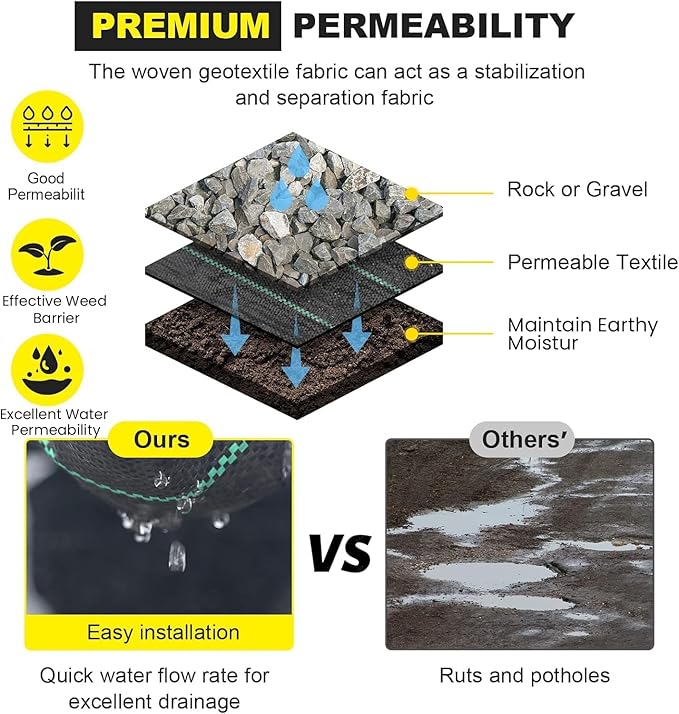 - 【Excellent Permeable Textile】- The woven geotextile fabric is highly permeable and breathable, without worries about water pooling. It is ideal for french drains, garden planting, and landscaping,to provide convenience on the driveways.
