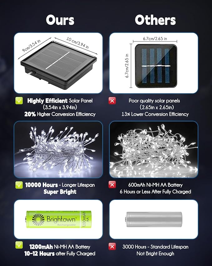- Highly Efficient Solar Panel(3.54in x 3.94in) & Auto On/Off - With 20% high conversion efficiency, fast charge in 4-6 hours. The solar fairy lights outdoor last for 10-12 hours after fully charged. The outdoor solar lights will be auto on at dusk and auto off at dawn, No wire connection and household electricity required