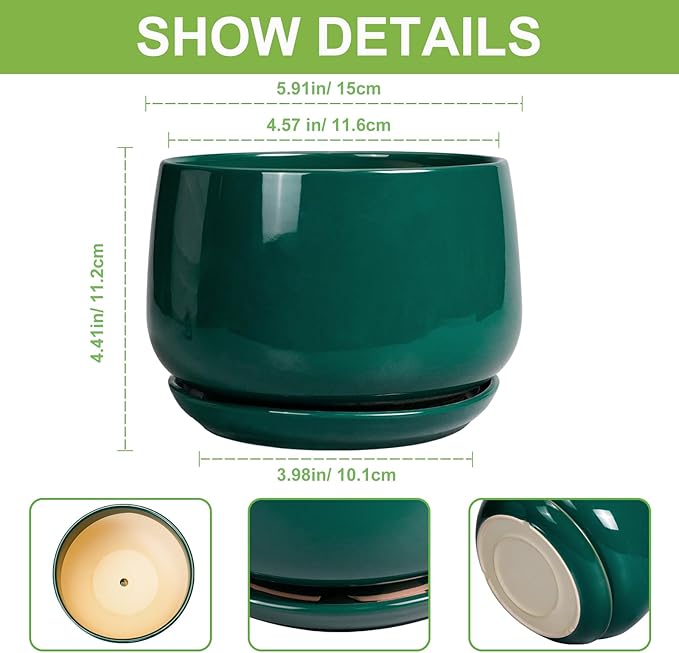 G EPGardening 6 Inch Plant Pot - Ceramic Planter for Indoor Plants, Round Planter with Drainage and Ceramic Tray, Flower Pots for Outdoor, Modern House Decor, Gift for Men Women, Green