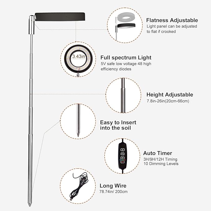- ๐ Space-Saving Adjustable Height - Telescopic arm (8"-26") fits tabletop planters, shelf gardens, or hanging pots, positioning the grow light at ideal PAR distance for each plant type