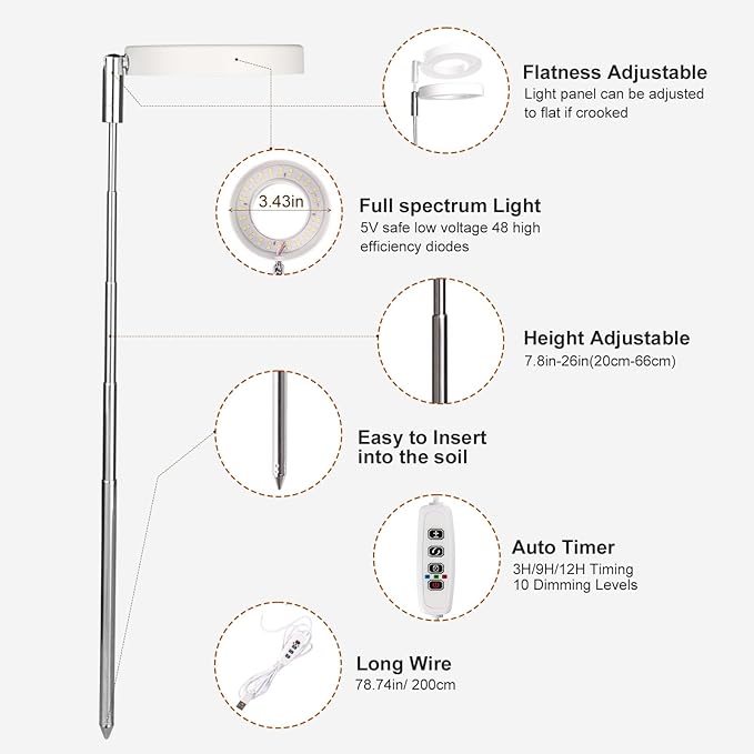 - ๐ Space-Saving Adjustable Height - Telescopic arm (8"-26") fits tabletop planters, shelf gardens, or hanging pots, positioning the grow light at ideal PAR distance for each plant type