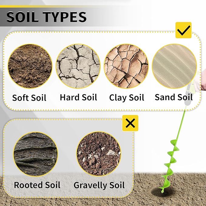 - 【Applicable Soil】Our auger drill bit for planting is ideal for use in sandy, loamy, and clay soils that are relatively soft. It excels in these types of soil, ensuring efficient and precise drilling. However, it is not recommended for soils with many rocks or dense root systems, as these can hinder its performance.
