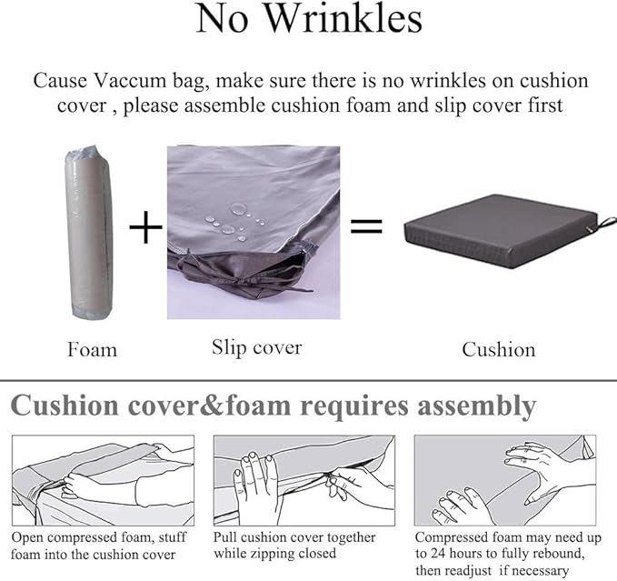 - 【Comfort & Support】 Experience ultimate comfort with the high density foam of these patio chair cushions set of 2. They provide excellent support for your hip, promoting good posture and allowing you to relax for extended periods of time. All outdoor dining chair cushions are packed with vacuum bag. You need to assemble cushion to make there is no wrinkles in cushion covers