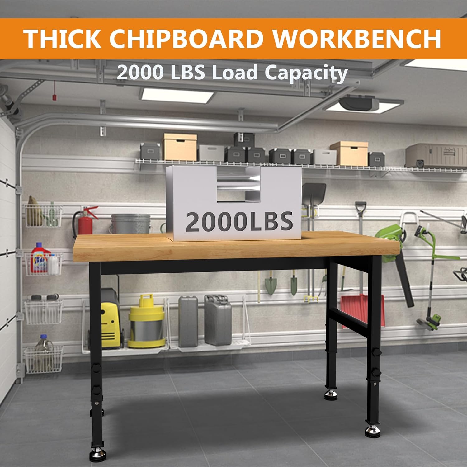 - Heavy-Duty Construction: Built with a premium chipboard tabletop and a robust steel frame, this work benches for garage can support up to 2000 lbs, making it ideal for heavy-duty tasks. Its durable construction ensures stability and longevity, making it a reliable choice for professional workshops, garages, and demanding home projects.