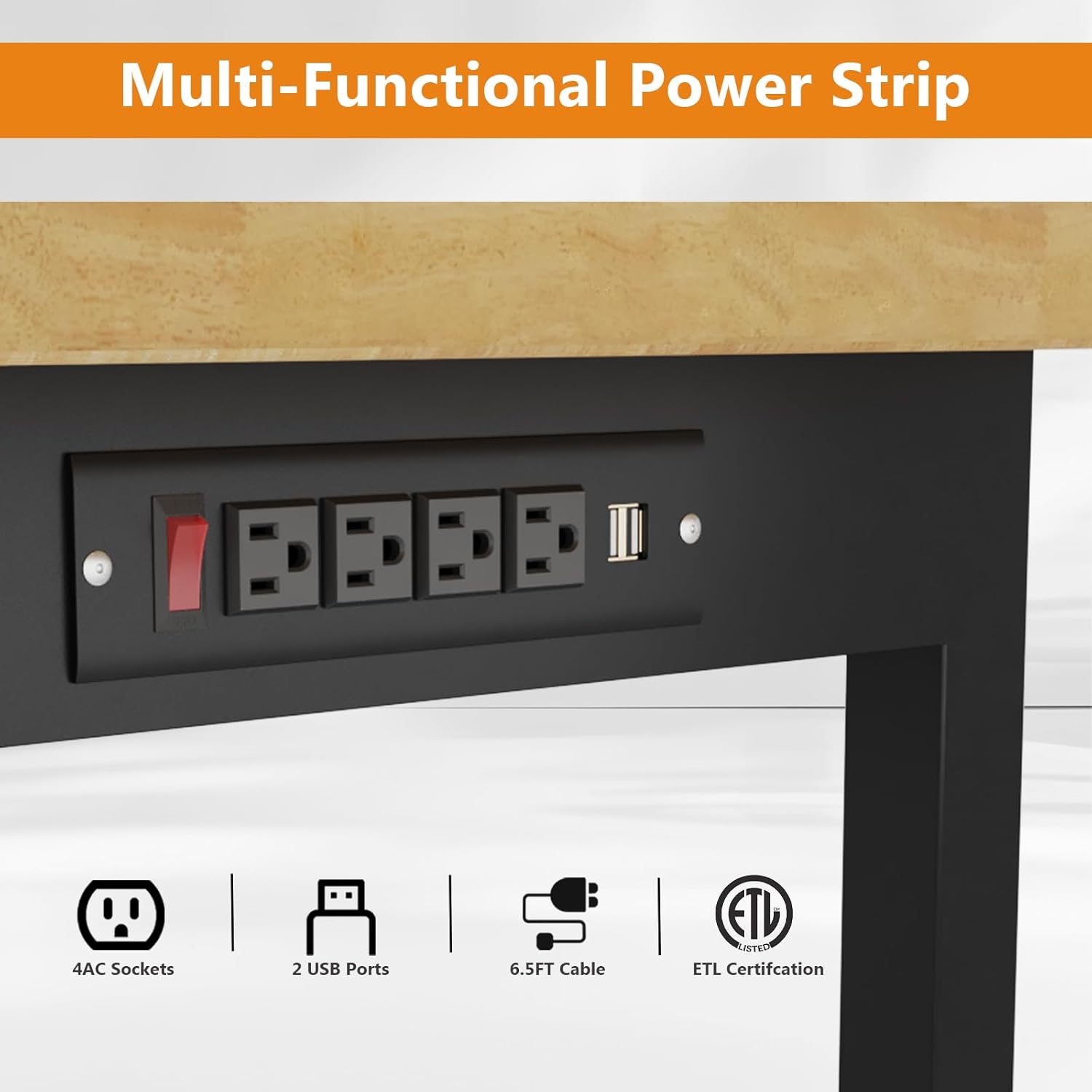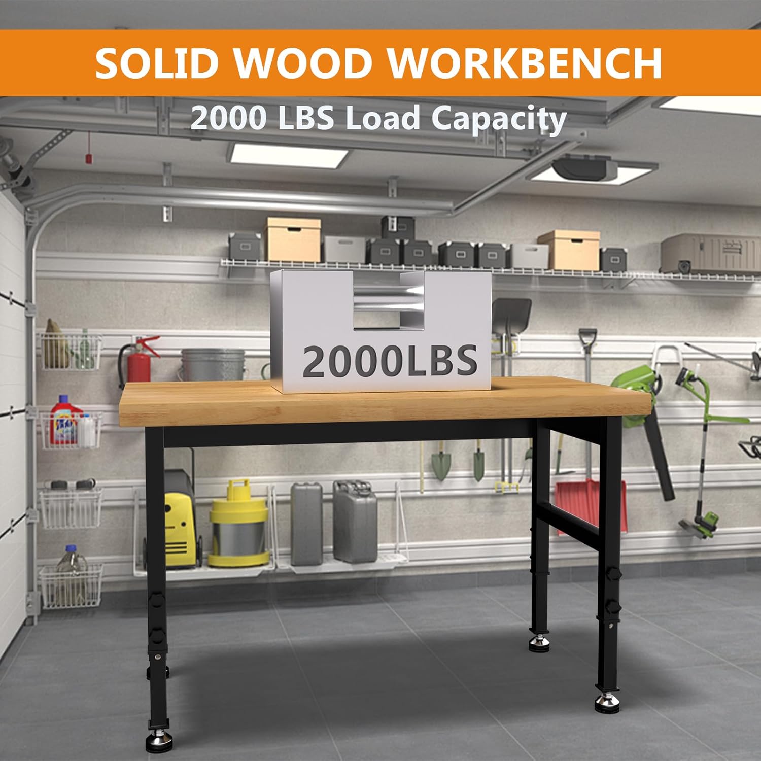 48" Work Bench, Adjustable Height Workbench with Rubber Pad, Heavy-Duty Solid Wood Work Table with Power Outlets, 2000 LBS Capacity Workstation for Garage, Workshop, Office, Home