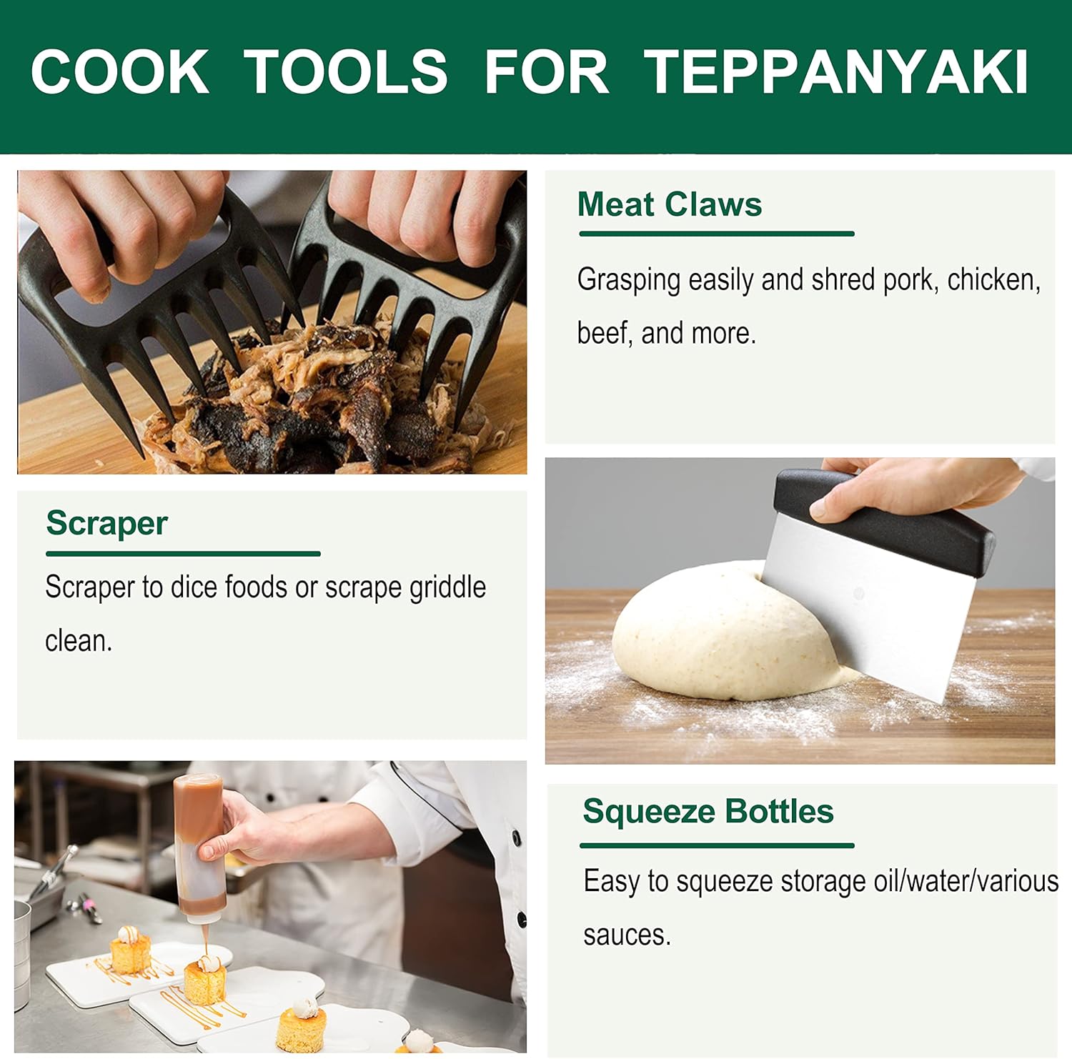- Professional Chef's Choice - Featured the properties of anti-scratching and anti-slip which is relying on a combination of well-design, exquisite craftsmanship and solid construction, these griddle tools are used by professionals and establishments for their kitchen. With the complete flat top griddle accessories set, you could make delicious burgers, juicy steak, perfect pancakes and flavorful cuisines from start to finish with ease like a pro!