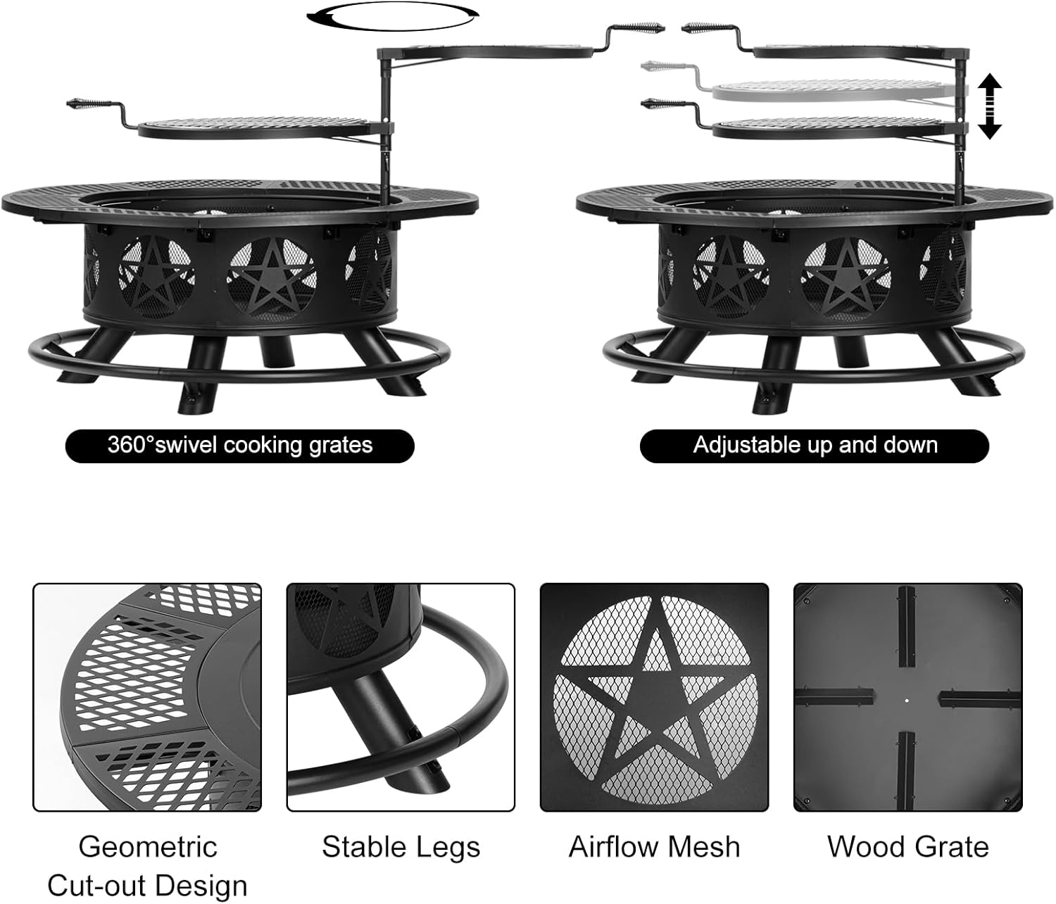 - [Beautiful & Humanized Design]OutVue fire pit table comes with 2 height-adjustable and 360ยฐ swivel grills which disassemble freely. You can barbecue, keep food warm or put pan to cook on them. The side of wood-burning fire pit is created with classic stars cut-out design which catches firelight for creating fun shadows. The drilled design promotes airflow and keeps the fire strong. All sophisticated designs of the fire pits for outside are dedicated to the warmth and comfort for you.
