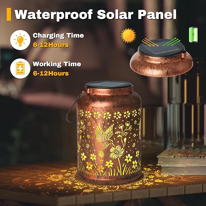 - Exquisite Decoration Design: The retro appearance, with gold copper color and hollow out metal veneer, the solar outdoor lanterns casts bright and warm light in darkness, accompanied by gorgeous and graceful Hummingbird patterns, adding a beautiful atmosphere to the surrounding environment.