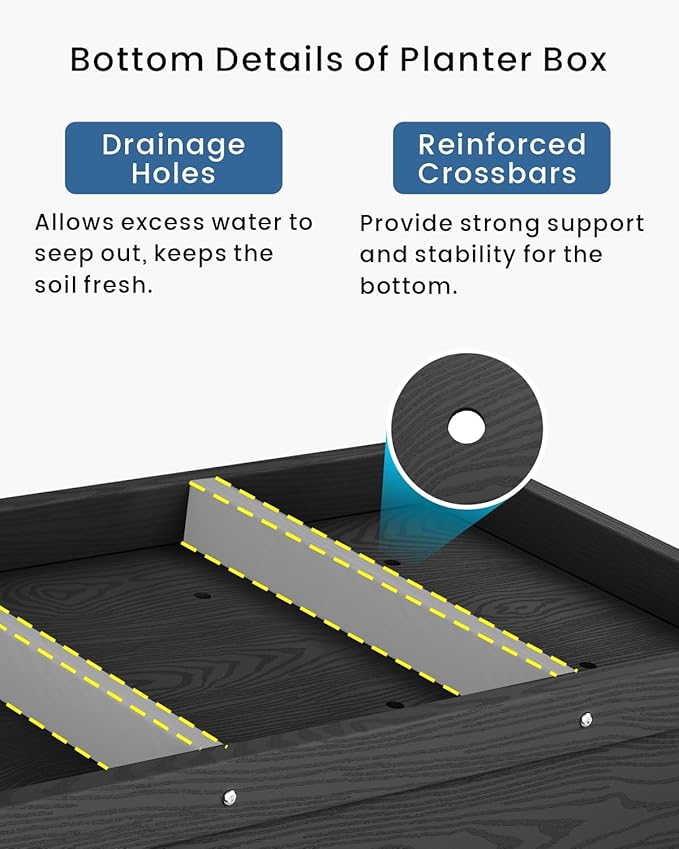 - Drainage System: This planter box is equipped with drainage holes at the bottom to allow excess water to drain out, keeping the soil fresh. Two reinforcing crossbars provide added support, preventing the bottom from detaching.