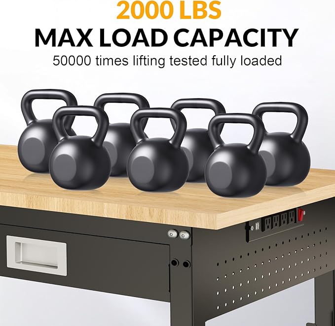 48" Workbench with Drawers, Adjustable Height Work Bench 2000 LBS Heavy-Duty Work Table Rubber Wood Work Station with Power Outlet & Pegboard for Garage, Office, Workshop, Home, Party Shop