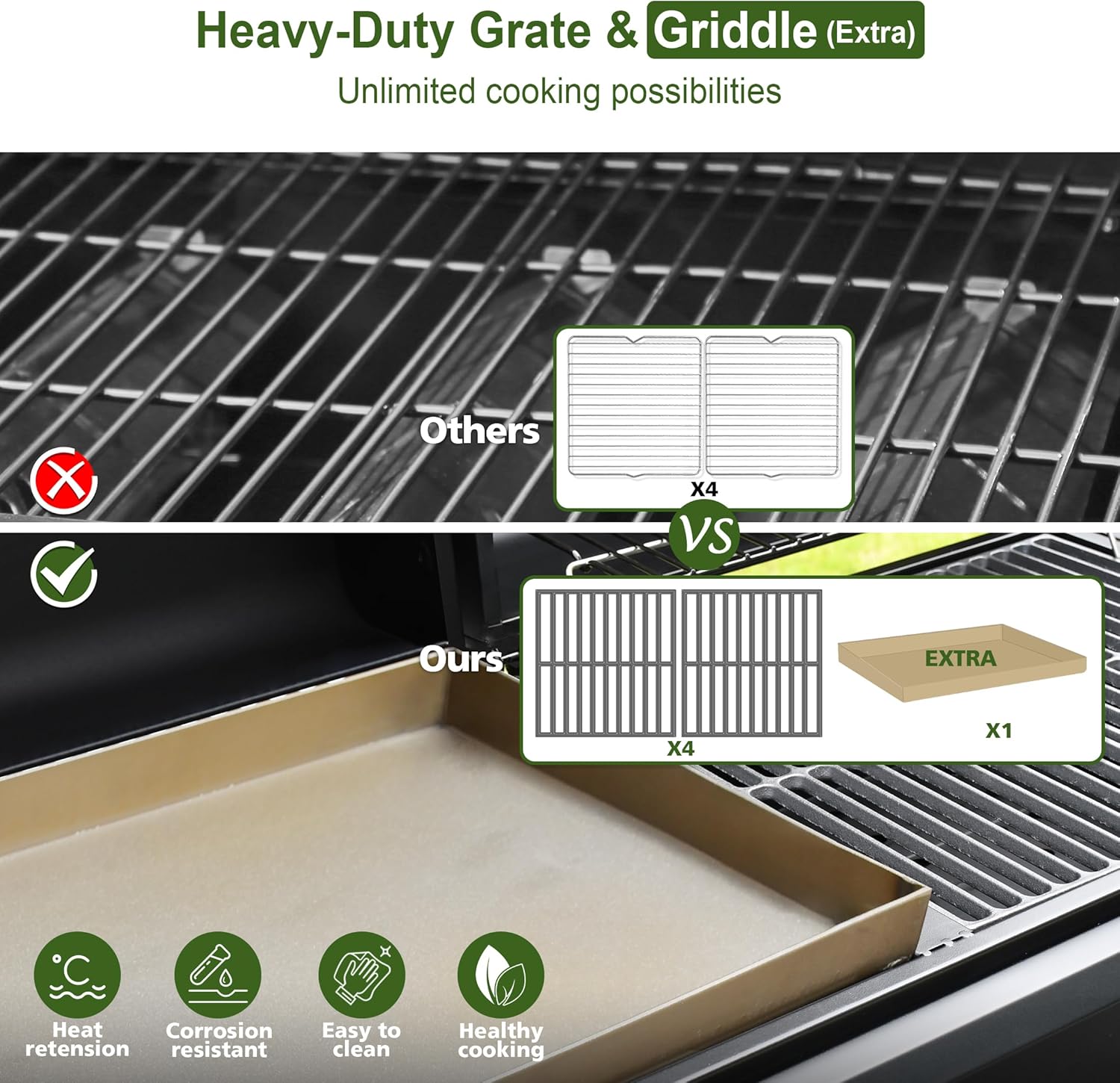 - 678 sq.in. MASSIVE BBQ SPACE: Our grill combines a spacious 472 sq.in. cast iron cooking area with a 206 sq.in. warming rack, perfect for large gatherings. Heavy-duty cast iron grates provide lasting durability and rust resistance, ensuring your grill stands the test of time