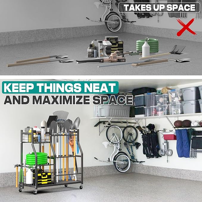 EVERHANGER Garden Tool Organizer Stand, Garage Tool Storage Organization, Yard Tool Racks with lockable wheels, Fit for Long-Handled Tools/Rakes/Brooms