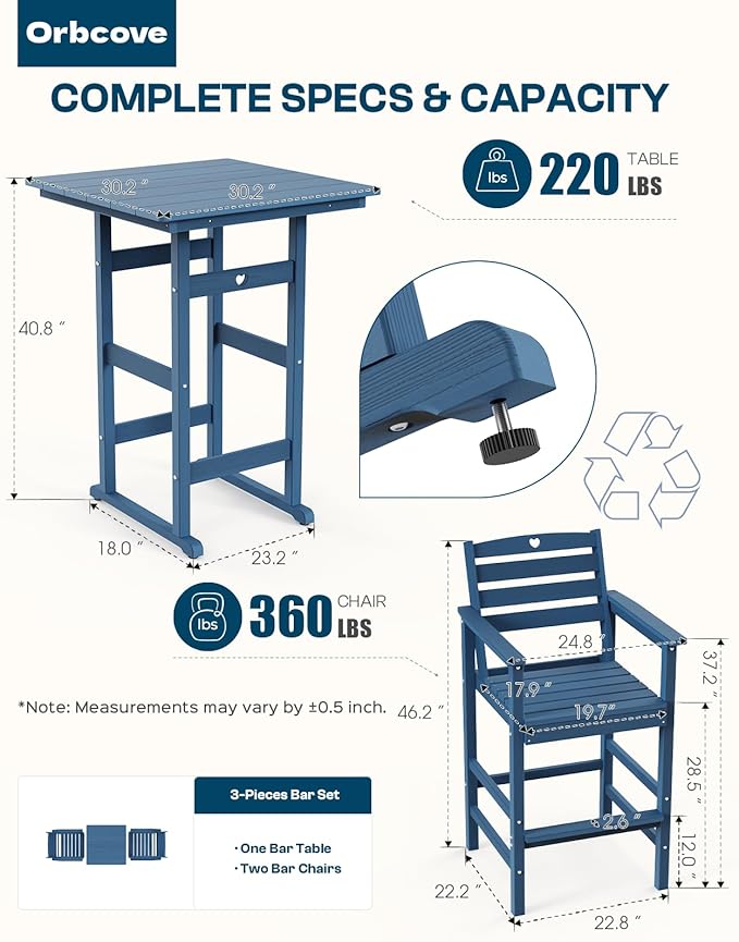 - Durable All-Weather Design: (Please note!!!Your order consists of two separate packages, which may be delivered at different times.) Crafted from HDPE with a natural wood grain finish, Orbcove patio table and chairs set withstands sun, rain, and wind without fading or cracking. Ideal for deck furniture, backyard furniture, or porch furniture, itโs perfect for year-round outdoor living.