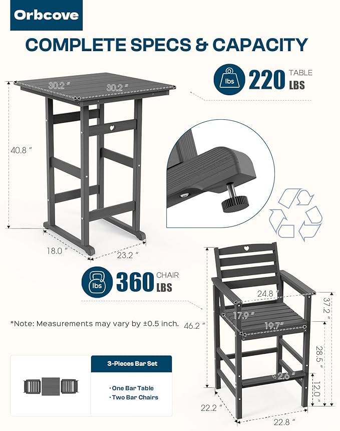 - Durable All-Weather Design: (Please note!!!Your order consists of two separate packages, which may be delivered at different times.) Crafted from HDPE with a natural wood grain finish, Orbcove bar table and chairs set withstands sun, rain, and wind without fading or cracking. Ideal for deck furniture, backyard furniture, or porch furniture, itโs perfect for year-round outdoor living.
