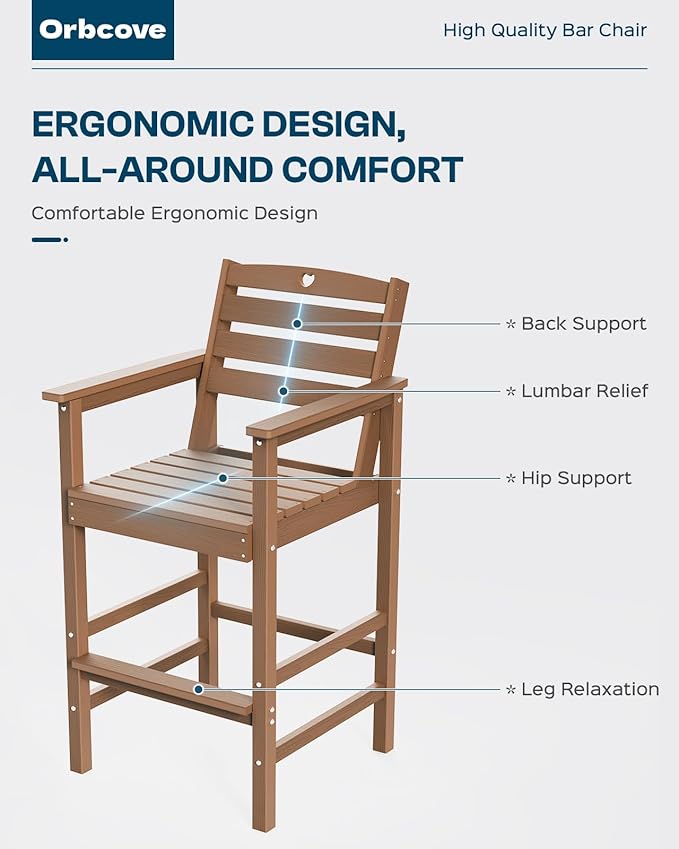- Durable All-Weather Design: (Your order will arrive in two separate shipments, which may not be delivered simultaneously.) Crafted from HDPE with a natural wood grain finish, Orbcove bar table and chairs set withstands sun, rain, and wind without fading or cracking. Ideal for deck furniture, backyard furniture, or porch furniture, itโs perfect for year-round outdoor living.