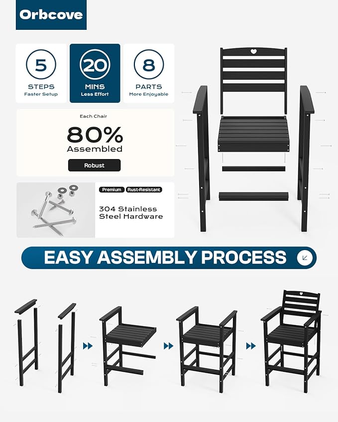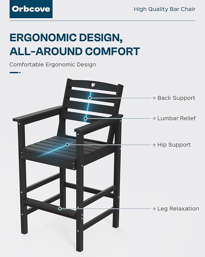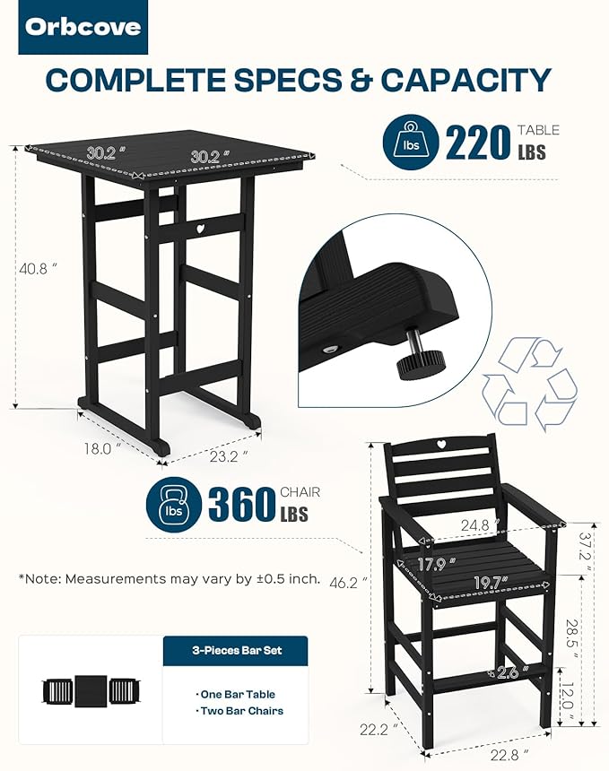 - Durable All-Weather Design: (Please note!!!Your order consists of two or three separate packages, which may be delivered at different times.) Crafted from HDPE with a natural wood grain finish, Orbcove bar table and chairs set withstands sun, rain, and wind without fading or cracking. Ideal for deck furniture, backyard furniture, or porch furniture, itโs perfect for year-round outdoor living.